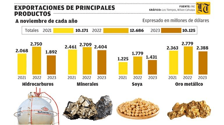 Las exportaciones de Bolivia entre enero y noviembre de 2023 disminuyeron a 10.125 millones de dólares en comparación con los 12.686 millones de dólares en el mismo período de 2022, lo que representa una caída de 2.561 millones de dólares.