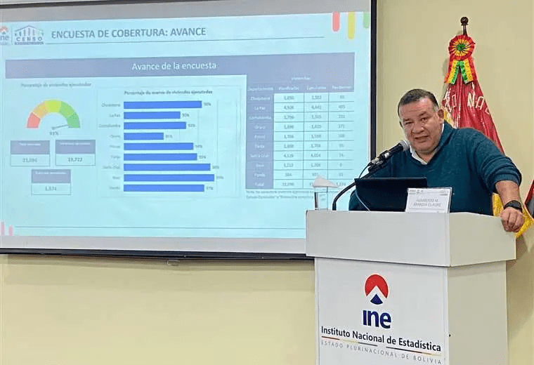 Además, Arandia informó sobre la encuesta de cobertura del censo, que comenzó el 23 de mayo y alcanzó un 93% de avance en las 21.096 viviendas programadas. La encuesta concluirá el 22 de junio, y hasta la fecha se ha realizado en 19.722 viviendas, con Beni, Pando y Santa Cruz cerca del 100% de cobertura.