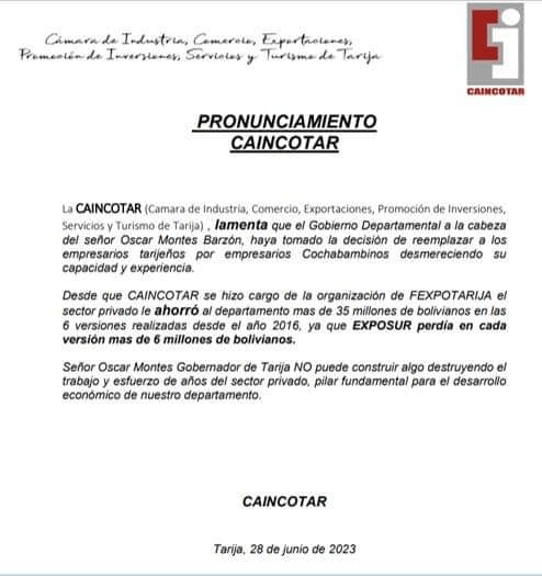 Federación de Empresarios Privados de Tarija saco un pronunciamiento en la que criticaban el actuar de la Gobernación de Tarija que, según ellos, hicieron a un lado a los empresarios privados de la ciudad. Por otro lado, Oscar Montes, gobernador de Tarija, mencionó que no entiende la razón del pronunciamiento ya que la “Exposur” es una feria diferente a la “Fexpo Tarija”.