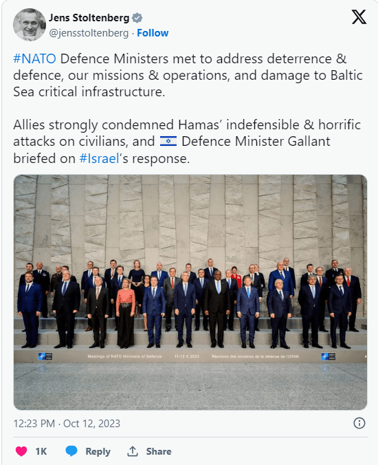 Durante una reunión de ministros de Defensa de la OTAN en Bruselas, el ministro de Defensa israelí, Yoav Galant, mostró imágenes de la masacre perpetrada por Hamás en Israel. La OTAN expresó su apoyo a Israel pero instó a responder de manera proporcional a los ataques de Hamás.