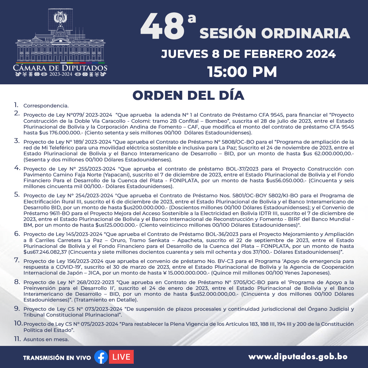 En la nueva convocatoria, se agregaron dos puntos relacionados con las leyes 073 y 075, destinadas a cesar a los actuales magistrados prorrogados y suspender plazos procesales en los altos tribunales durante el período de elecciones judiciales. Sin embargo, el orden del día propuesto ha generado controversia, ya que algunos grupos proponen tratar primero las leyes antiprórroga, mientras que otros sugieren abordar primero los créditos internacionales.