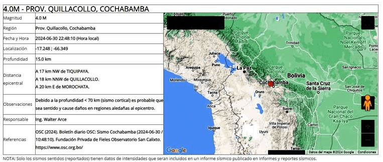 El Observatorio San Calixto reportó un sismo de magnitud 4.0 ocurrido en Cochabamba el domingo, 30 de junio a las 22:48:10 (hora local). El epicentro se localizó a 17 km al noroeste de Tiquipaya, 18 km al norte-noroeste de Quillacollo y 20 km al este de Morochata.